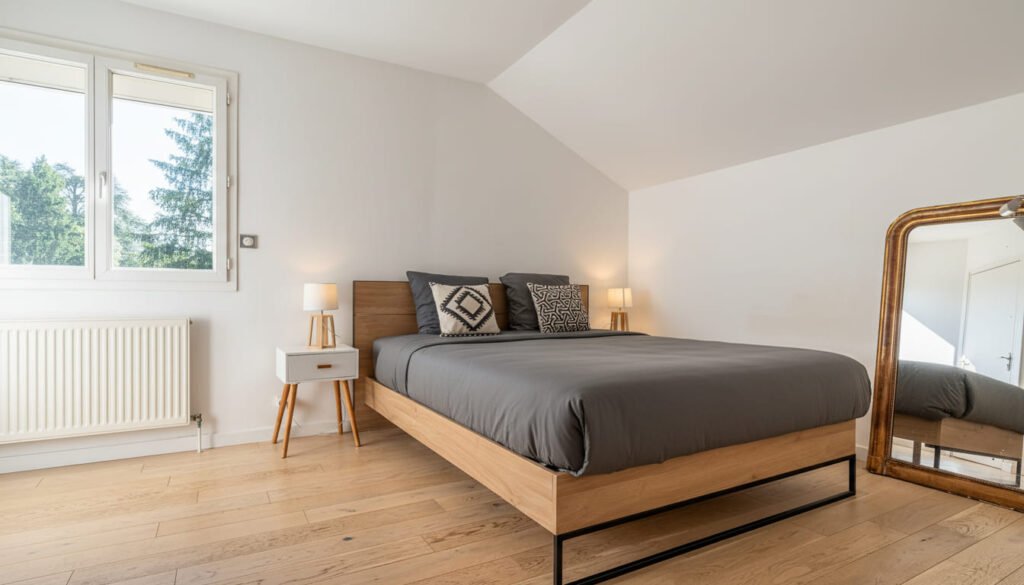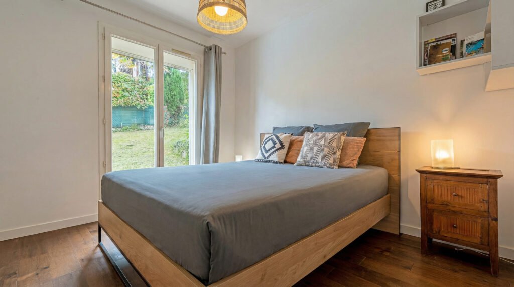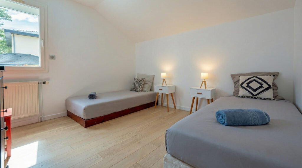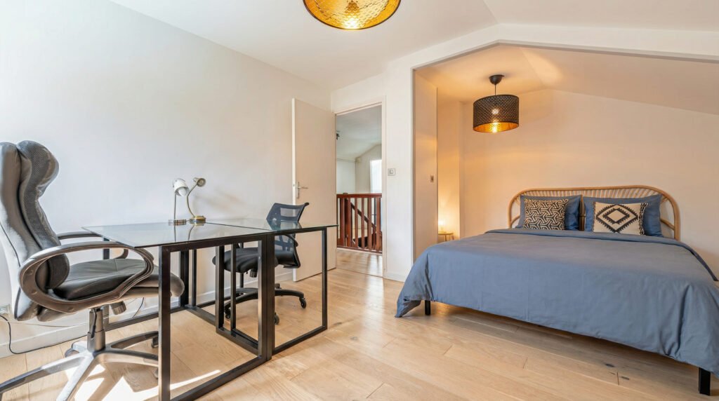 - 2 suites parentales avec lit queen size (160 × 200 cm) et salle de bain attenante privative • 1 grande chambre avec lit double (160 × 200 cm) et espace de travail composé de deux bureaux, idéal pour les séjours professionnels ou les étudiants • 1 chambre avec deux lits simples spécialement pensée pour les enfants Les 4 chambres disposent de rangements suffisants pour vos affaires.