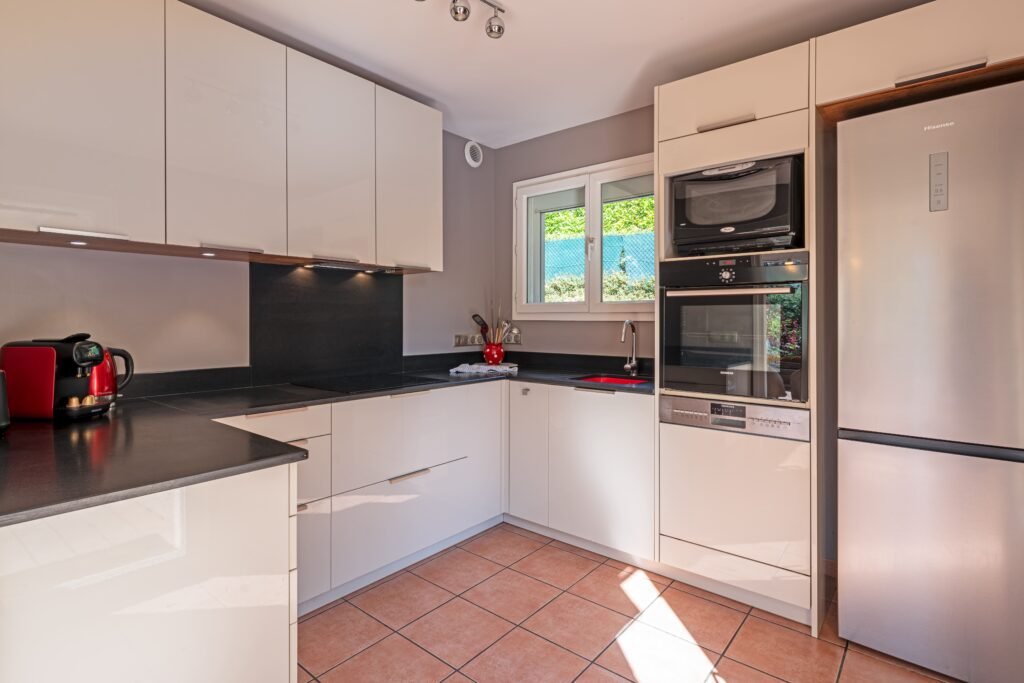 - Four • Lave-vaisselle • Plaque à induction • Cafetière • Réfrigérateur froid tournant • Micro-ondes • Grille-pain • Bouilloire électrique • Vaisselle et ustensiles de cuisine complets